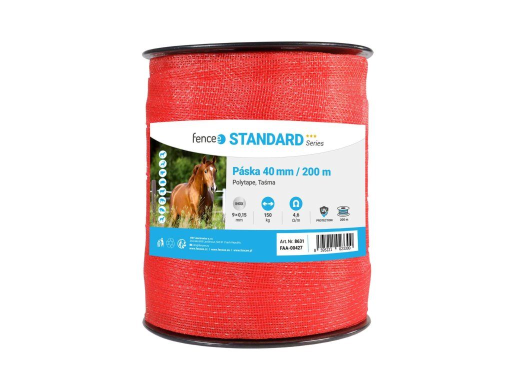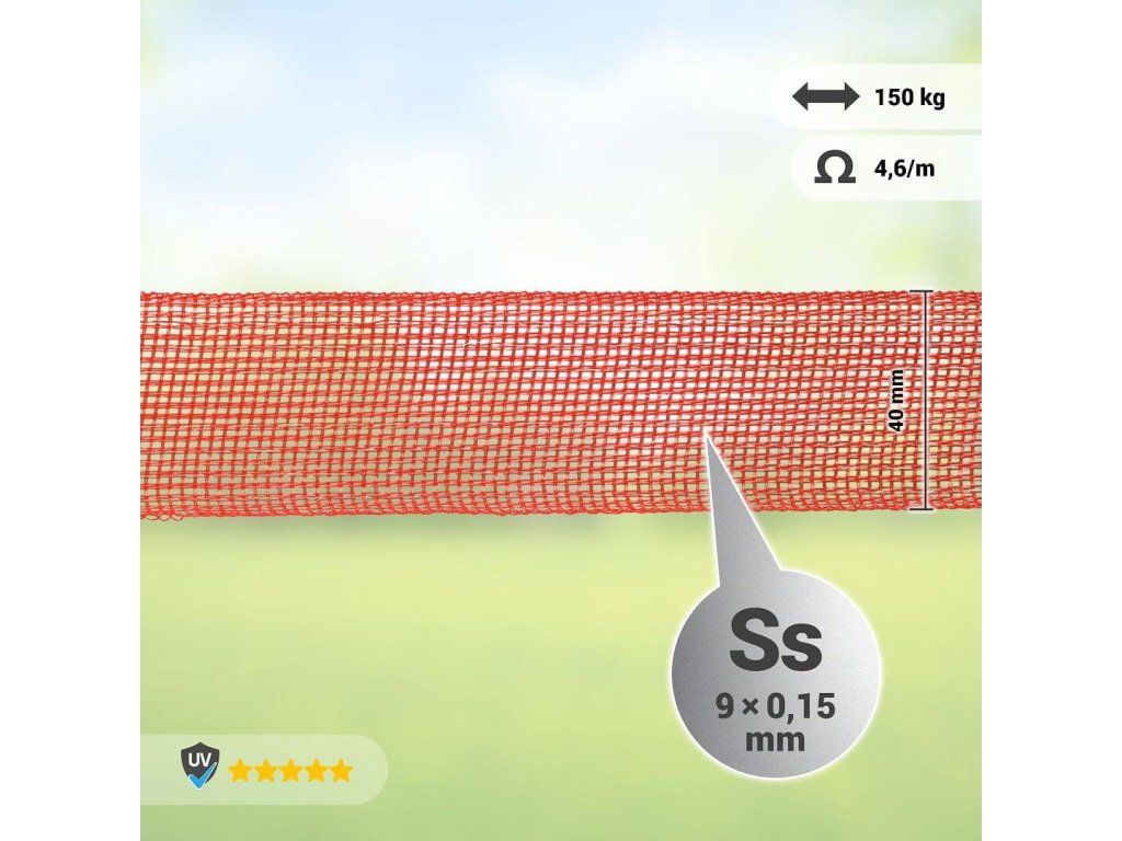 Pevná a odolná oranžová ohradníková páska s UV ochranou pro dlouhodobé kvalitní ohrazení koní i jiných zvířat. Kvalitní 9 × 0,15 mm nerezový vodič. Skvělý poměr ceny, výkonu a kvality. Univerzální použití pro běžné instalace. Odpor 4,6 Ω/m.