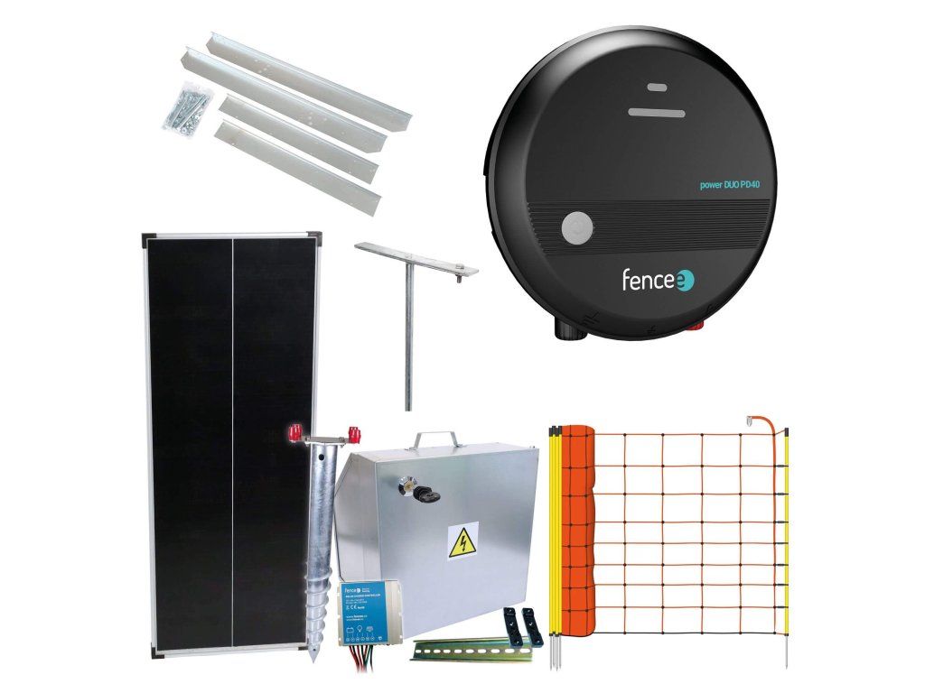 Obsahuje bezpečnostní schránku na zdroj a baterii s regulátorem a solárním panelem 100 W. Schránku lze elektrifikovat proti krádeži a díky bezpečnostnímu trnu ji stabilně ukotvit. Součástí sady je zemnící tyč a 50 m dlouhá ohradníková síť o výšce 90 cm.