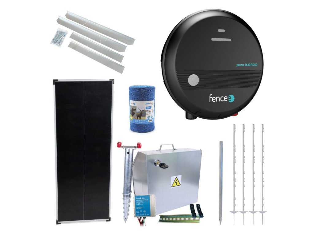 Obsahuje bezpečnostní schránku na zdroj a baterii s regulátorem a solárním panelem 100 W. Schránku lze elektrifikovat proti krádeži a díky bezpečnostnímu trnu stabilně ukotvit. Součástí sady je zemnící tyč, 400 m modrého lanka a 20 ks plastových sloupků o délce 156 cm.