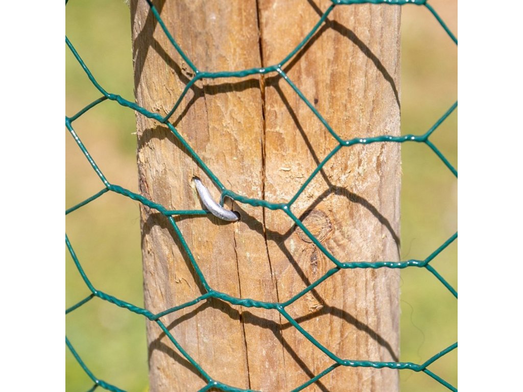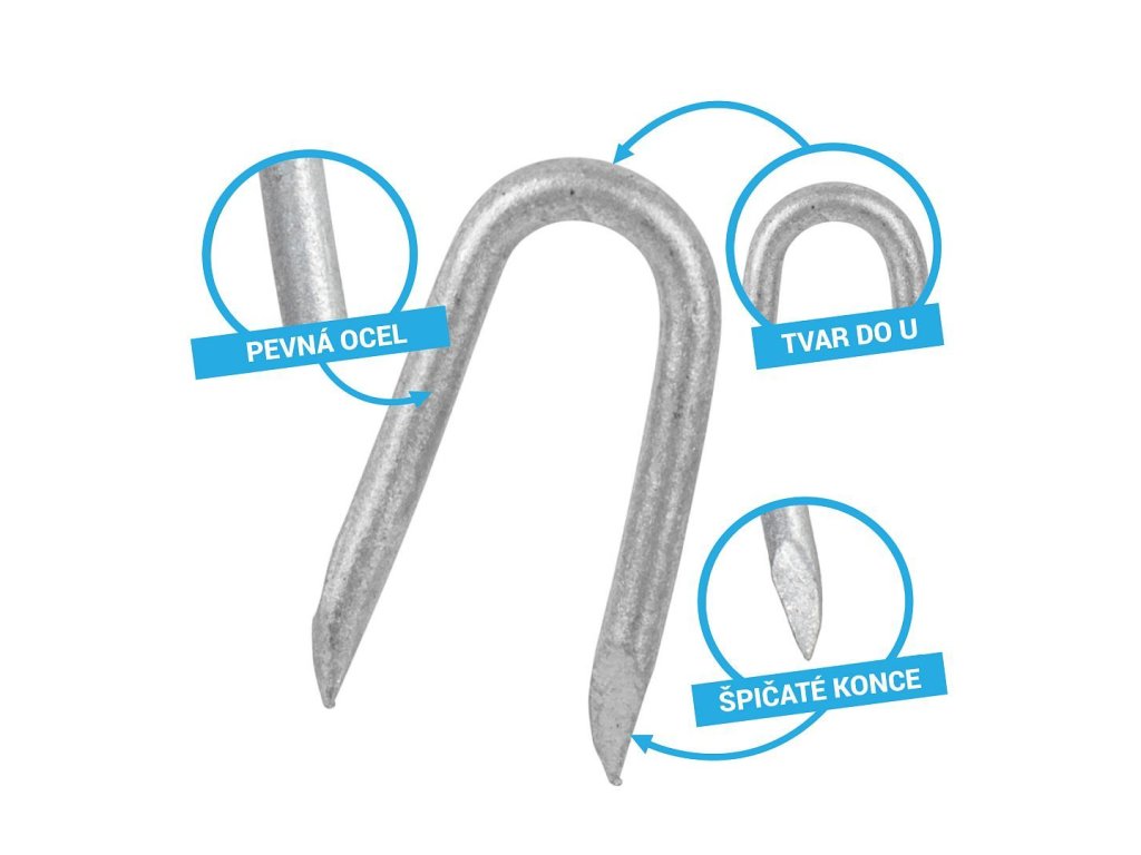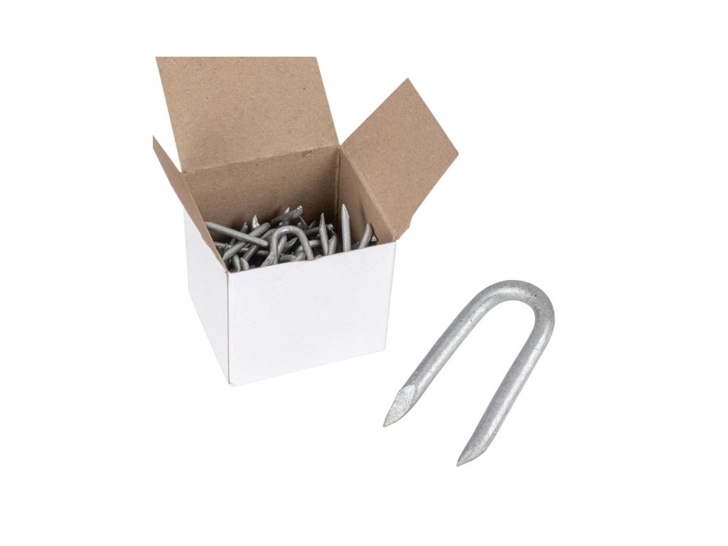 Zinkované skoby k upevnění ostnatého drátu, spona na uzlové ohradní pletivo 2,2 × 25 mm balení 100 g - tloušťka drátu 2,2 mm, délka 25 mm, zinkováno. Vhodné pro lesnické uzlové pletivo.