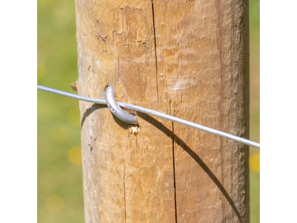Pozinkovaná skoba k upevnění ostnatého drátu, spona na uzlové ohradní pletivo 2,2 × 25 mm balení 100 g. Tloušťka drátu 2,2 mm, délka 25 mm, zinkováno.