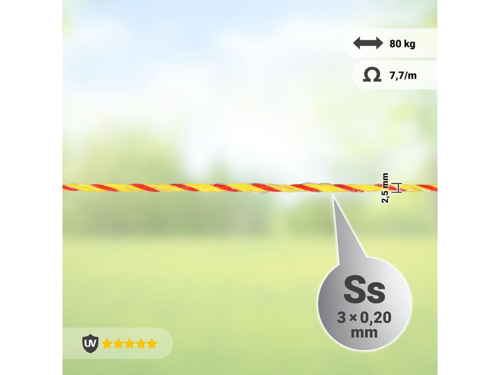 Kvalitní vodivé lanko určené pro univerzální použití u elektrických ohradníků. UV ochrana. Tři nerezové vodiče 3 × 0,20 mm. Délka 100 m, odpor 6,97 Ω/m. Vhodné na zahradu, dvorek. Dobře viditelné barevné provedení.
