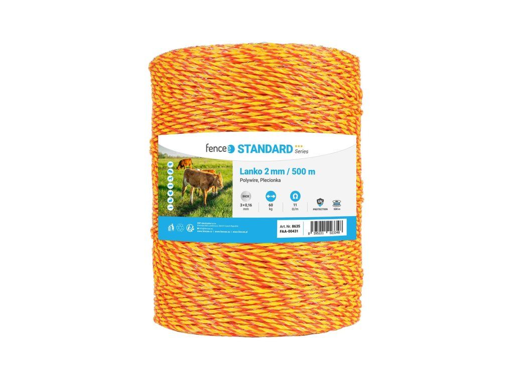 Žluto-oranžové lanko o průměru 2 mm a délce 500 m je ideální pro delší elektrické ohradníky. Díky své žluto-oranžové barvě je dobře viditelné pro hospodářská i divoká zvířata a zvyšuje účinnost ochrany. UV odolnost. Tři nerezové vodiče 3 × 0,16 mm.