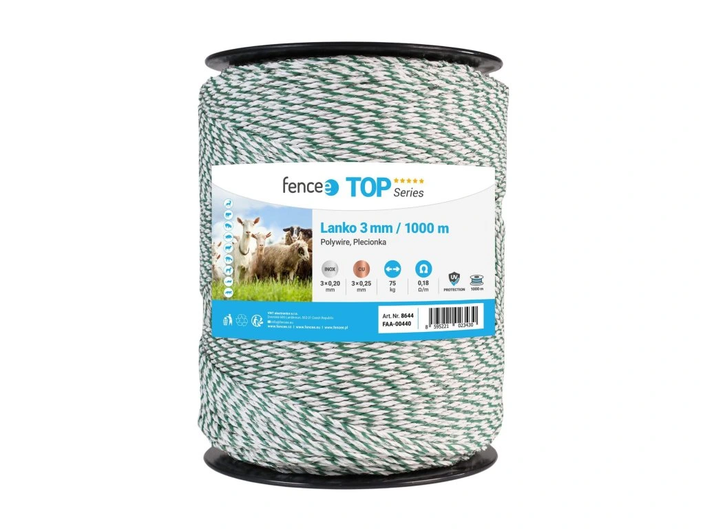 Velice kvalitní vodivé lanko určené pro univerzální použití u elektrických ohradníků. Je vyrobeno z pevného materiálu, odolného proti roztržení. Odpor pouze 0,18 Ω/m. Pevné nerezové 3 × 0,20 mm, měď 3 × 0,25 mm. Špičková kvalita. Vhodné pro dlouhé ohrady.