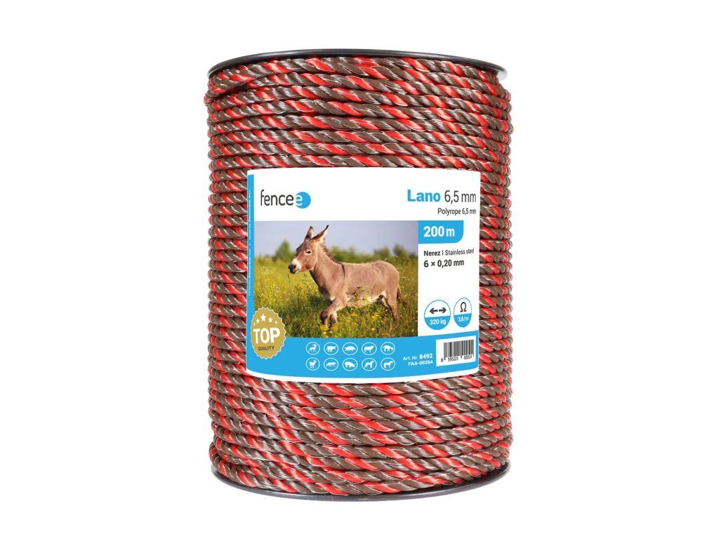 Vodivé lano pro elektrický ohradník s délkou 200 m. Hnědo-oranžové barevné provedení pro lepší viditelnost. Šest pevných nerezových vodičů uvnitř lana. Odpor 3,8 Ω/m.