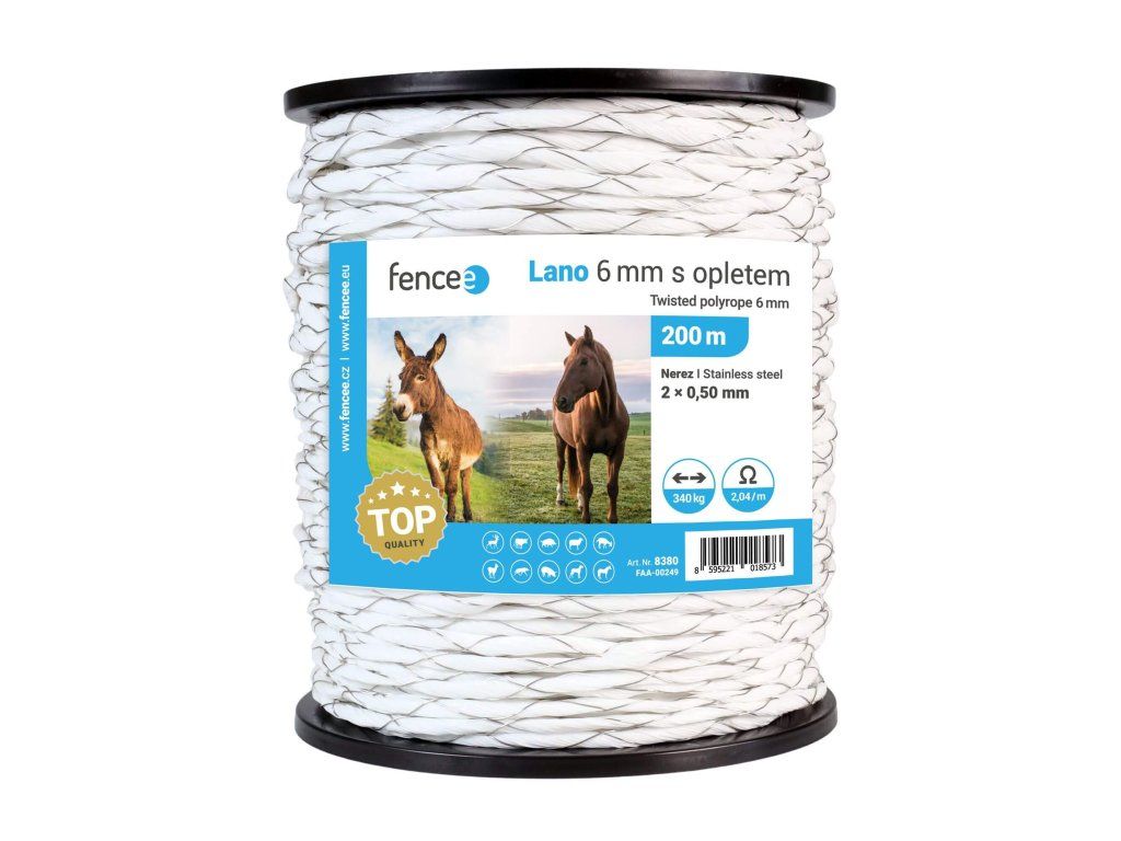 Vysoce kvalitní kroucené lano s drátěným opletem pro univerzální použití u elektrických ohradníků. Vhodné pro pasení skotu, koní, poníků, koz, ovcí i jako ochranu před lesní zvěří, divočáky. Vzhledem k bílé barvě a většímu průměru lana je dobře viditelné pro zvířata. Vlastnosti krouceného lana s drátěným opletem: Snadná manipulace a převíjení - vhodné pro padoky a dočasné ohrady Mimo sezónu lze snadno smotat a uskladnit Bílá barva pro odlišení od okolního prostředí Vyniká větší odolností proti roztržení Kvalitní nerezové vodiče 2 × 0,50 mm Pevnost v tahu 340 kg délka návinu 200 m dlouhá životnost UV ochrana