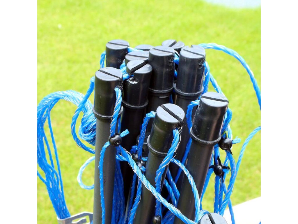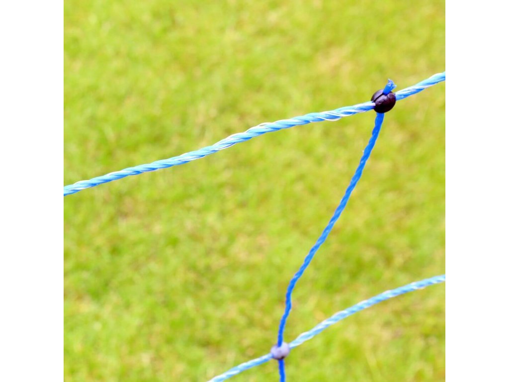 Modrá síť pro elektrický ohradník proti vlkům. Celkem 10 horizontálních lanek obsahuje 3 × 0,20 mm nerezových vodičů + vrchní zesílený pramen 6 × 0,20 mm se zvýšenou vodivostí.