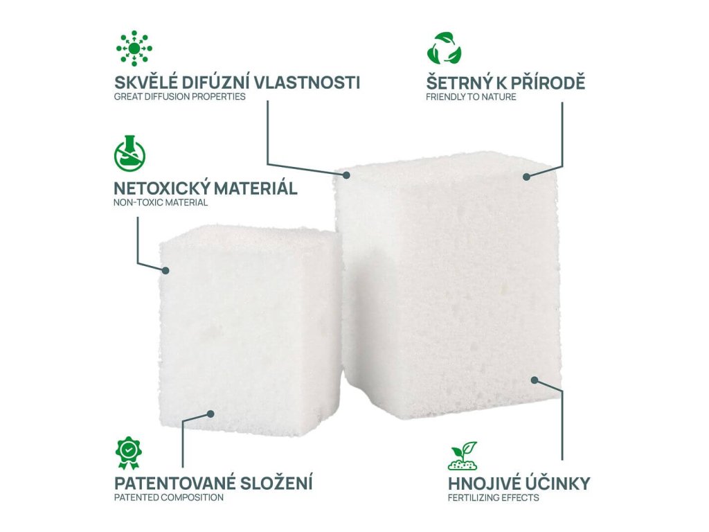- Díky otevřeným pórům má velmi vysokou účinnost a umožňuje postupné uvolňování pachového koncentrátu.
