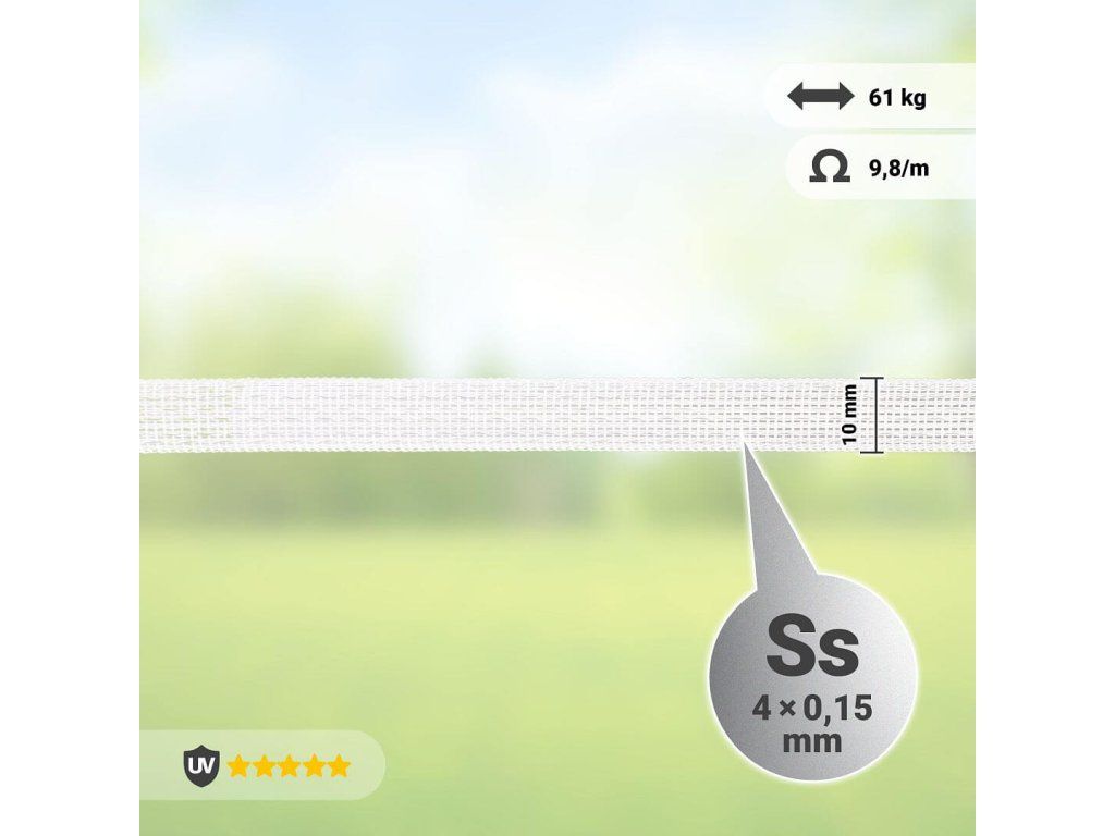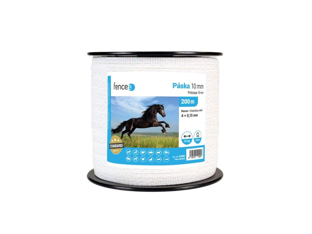 Lehká bílá páska pro elektrický ohradník s šířkou 10 cm. Délka návinu 200 m. Čtyři nerezové vodiče uvnitř. Vhodné pro krátké a středně dlouhé ohrady. Odpor 9,8 Ω/m.