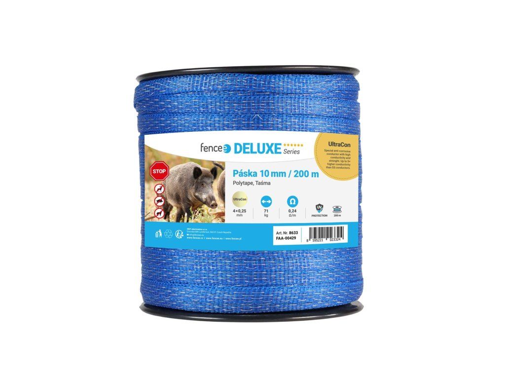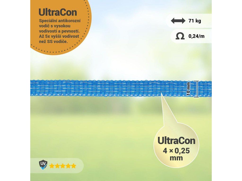 Kvalitní páska pro elektrický ohradník s vodičem UltraCon s vysokou vodivostí a pevností. UV ochrana. Díky velmi silným UltraCon vodičům 4 × 0,25 mm je páska velmi pevná a vydrží. Šířka 10 cm. Zajištění špičkové vodivosti - velmi nízký odpor 0,24 Ω/m.