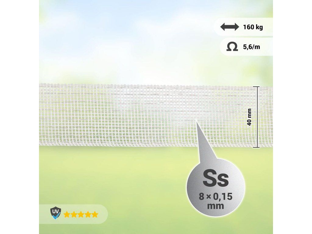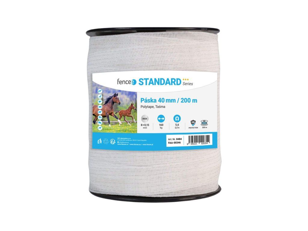Odolná bílá ohradníková páska v šíři 40 mm vhodná pro vysoké tahové síly – pevnost 160 kg, je určená pro ohrazení běžných i delších ohrad. Nerezový vodič 8 × 0,15 mm s odporem 5,60 Ω/m a UV ochranou. Délka 200 m. Snadná montáž.
