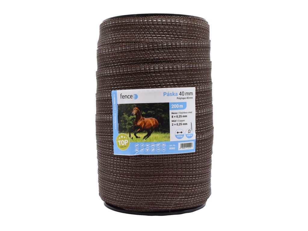 Vysoce vodivá ohradníková páska určená pro univerzální použití u elektrických ohradníků. Pro běžné, ale i náročné instalace. Vhodná i pro dlouhé ohrady. Vysoká pevnost zesílených okrajů, odolnost proti roztržení a UV ochrana zajišťují pásce dlouhou životnost. Přírodní hnědá barva splývá s prostředím. Páska je vhodná především pro koně. Lze ji ale použít pro mnoho dalších zvířat, jako je např. skot, ovce, kozy nebo prasata. Bezpečné pro zvířata – nehrozí pořezání. Kompletní sady elektrického ohradníku pro koně se vším potřebným k sestavení ohradníku pro koně. Vlastnosti hnědé ohradníkové pásky 40 mm: 8 × 0,25 mm kvalitní nerezový vodič 2 × 0,25 mm supervodivý měděný vodič s pozinkovou úpravou špičková kvalita - vysoká vodivost, trvanlivost odpor pouze 0,16 Ω/m délka 200 m Pro instalaci pásky na kůly použijte ploché izolátory z naší nabídky.