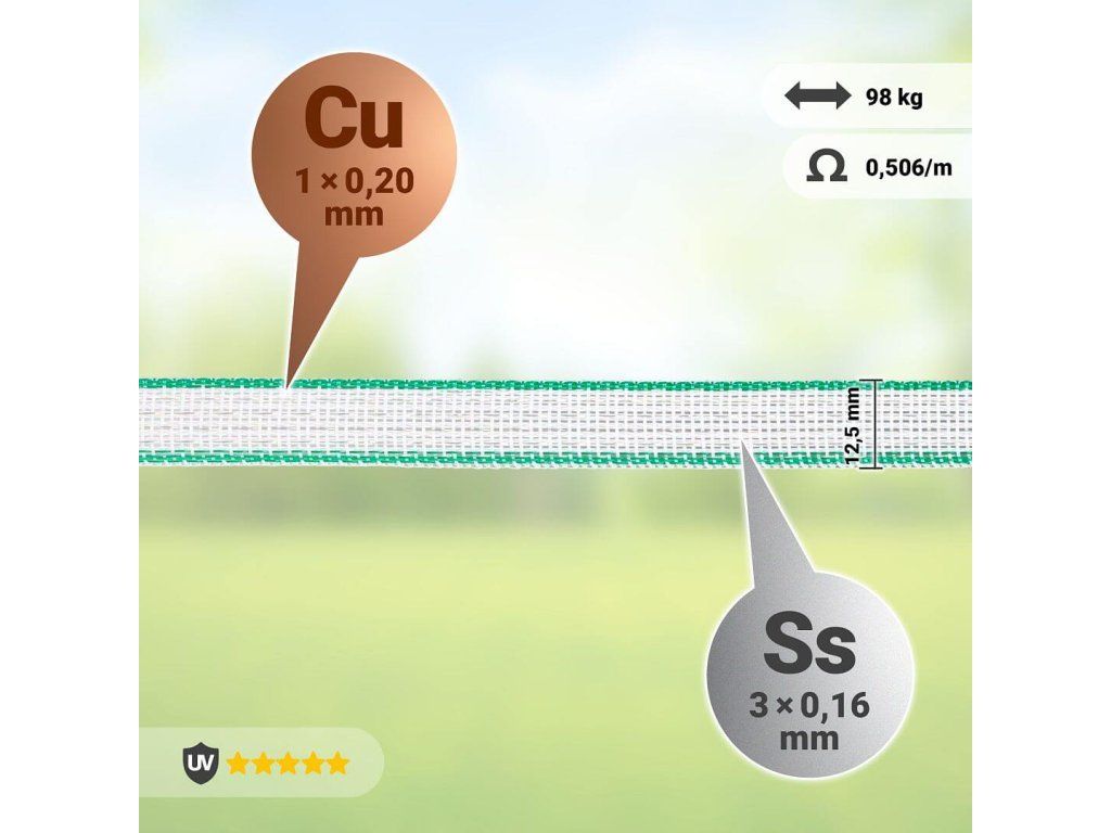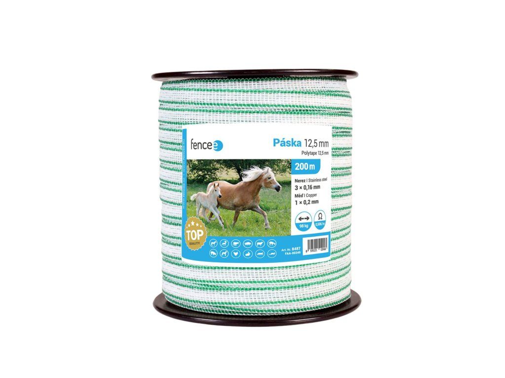 Velmi kvalitní lehká páska s šířkou 12,5 mm vhodná pro elektrický ohradník pro koně i jiná zvířata. Díky velmi nízkému odporu 0,5 Ω/m lze použit pro delší ohrady. Délka 200 m.