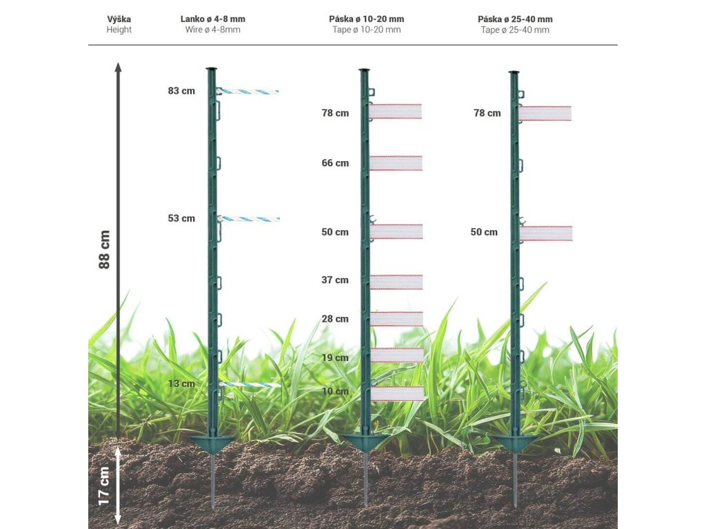 Plastový sloupek pro elektrický ohradník v přírodní zelené barvě s 10 očky pro vodiče elektrického ohradníku. Celková výška sloupku 105 cm, výška nad zemí 88 cm. Díky materiálu ze skleněných vláken je velmi odolný proti zlomení a snadno se instaluje pomocí kovové špice se dvěma nášlapy.