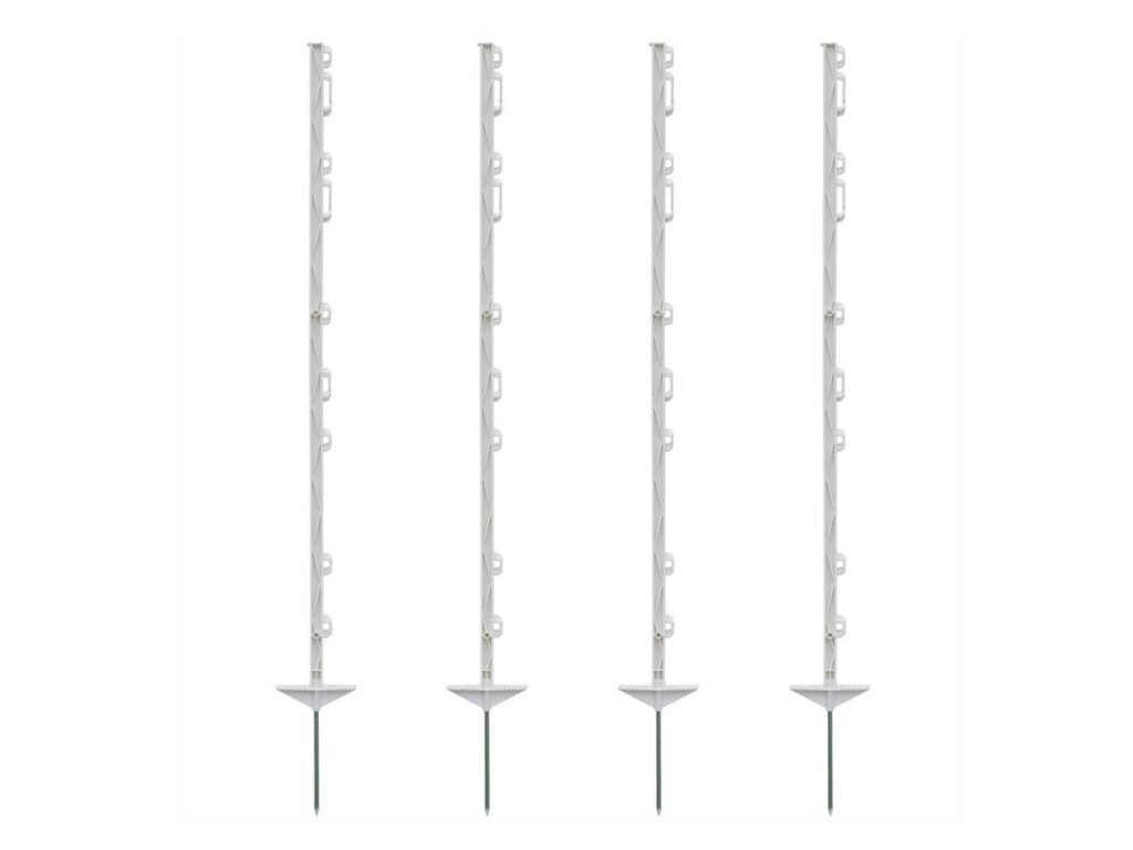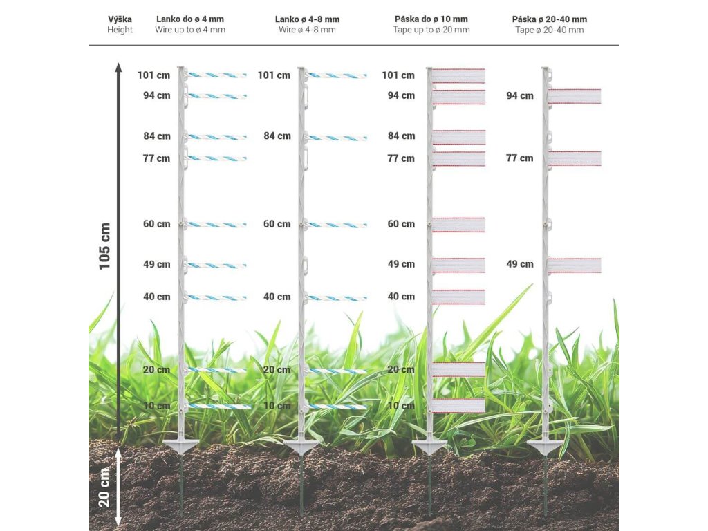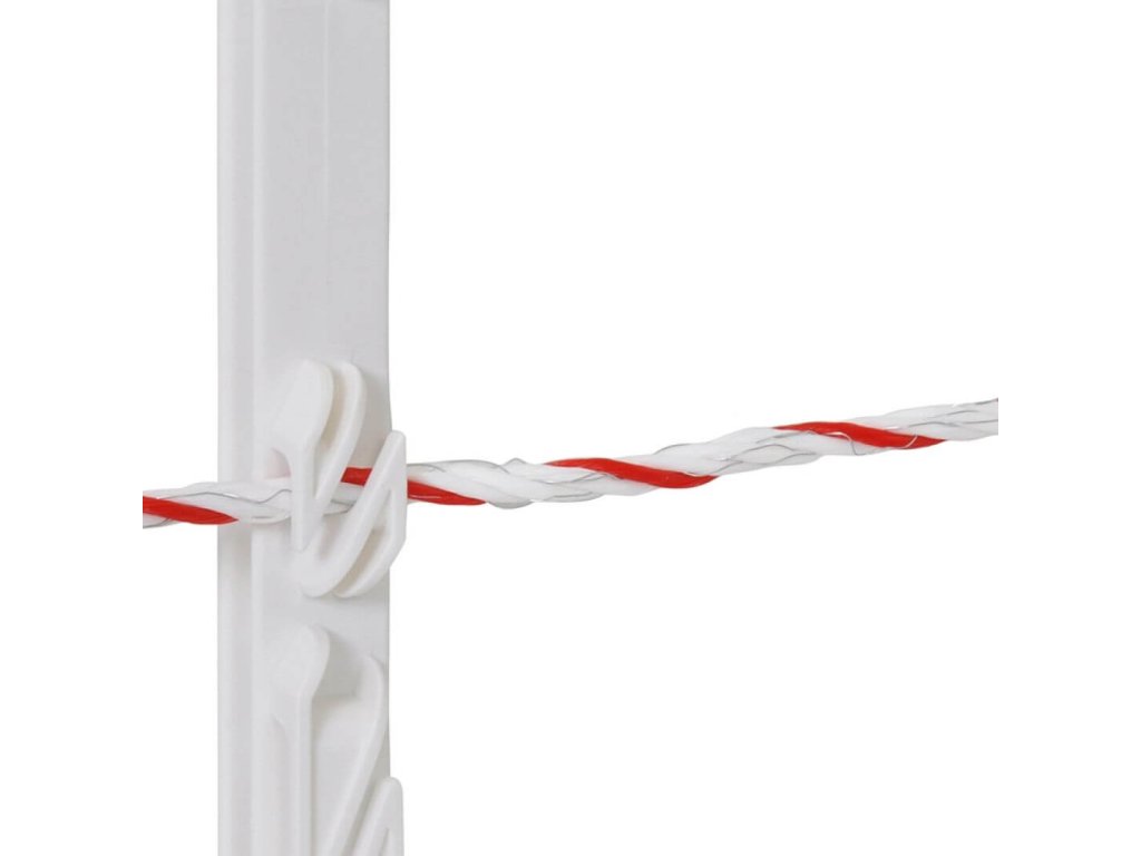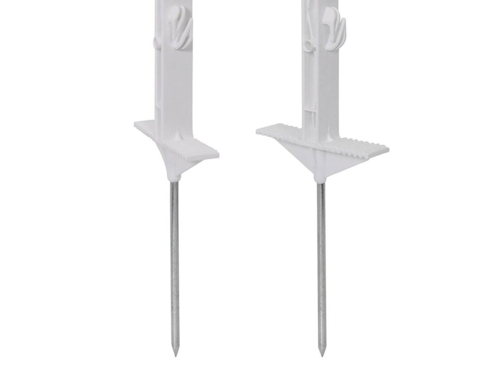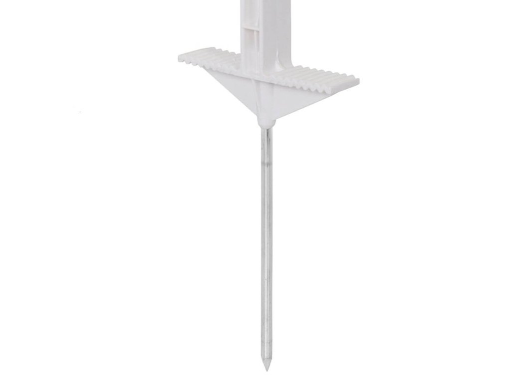 Univerzální plastový sloupek s dvojitým nášlapem pro elektrický ohradník v bílé barvě s 9 očky pro vodiče elektrického ohradníku. Kvalitní materiál s vyztužením ze skelných vláken a vysokou UV stabilitou je odolný proti vykřehnutí, ohýbání a zlomení. Kovová špice usnadní instalaci do země. Celková výška sloupku 125 cm, výška nad zemí 105 cm.