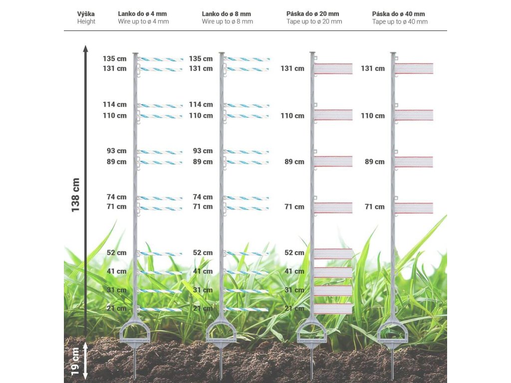 Vysoce kvalitní plastový sloupek s nášlapným třmenem pro elektrický ohradník v bílé barvě s 12 očky pro všechny běžné vodiče. Robustní provedení s vyztužením ze skelných vláken a vysokou UV stabilitou dělá sloupek velmi odolným proti ohýbání a zlomení. Celková výška sloupku 157 cm, výška nad zemí 138 cm.