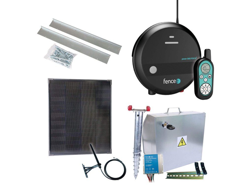 Sada solárně napájeného ohradníku s chytrým RF zdrojem 230/12 V o výkonu 1 J s dálkovým ovladačem. Obsahuje kompletní bezpečnostní schránku na zdroj ohrady a baterii s regulátorem 10 A pro solární panel 40 W.