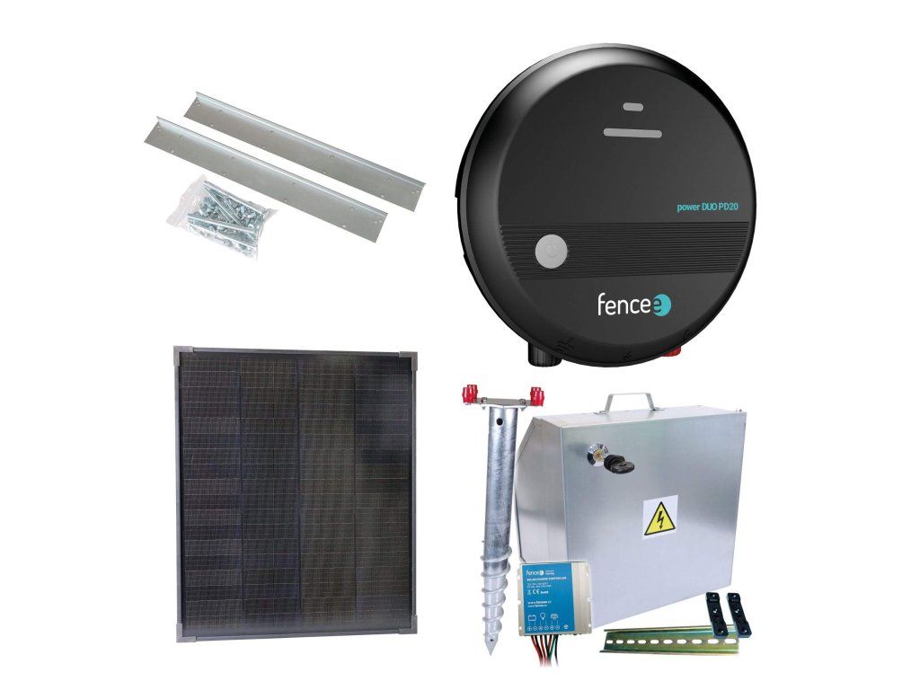 Sada solárně napájeného ohradníku s kombinovaným zdrojem 230/12 V o výkonu 2 J. Obsahuje kompletní bezpečnostní schránku na zdroj ohrady a baterii s regulátorem 10 A pro solární panel 40 W.