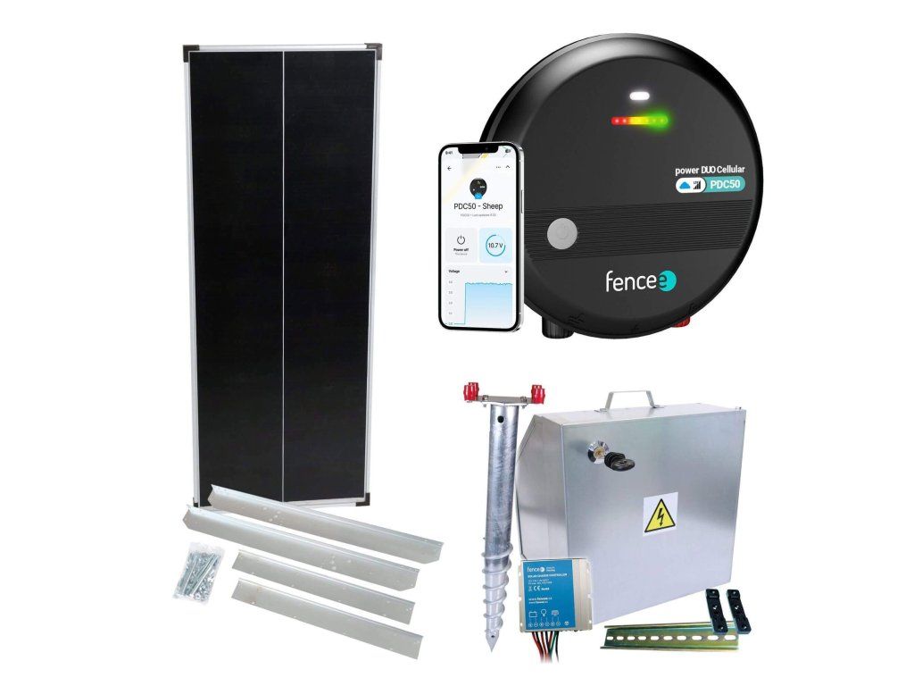 Sada solárně napájeného ohradníku s kombinovaným LTE zdrojem 230/12 V o výkonu 5 J. Obsahuje kompletní bezpečnostní schránku na zdroj ohrady a baterii s regulátorem 10 A pro solární panel 100 W.