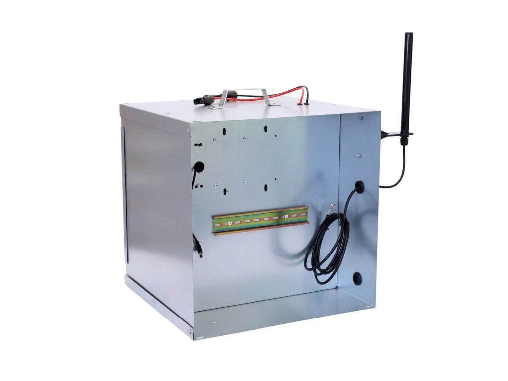 Kovová přenosná schránka z pozinkovaného ocelového plechu s uzamykatelnými posuvnými dvířky chrání zařízení před deštěm a krádeží.
