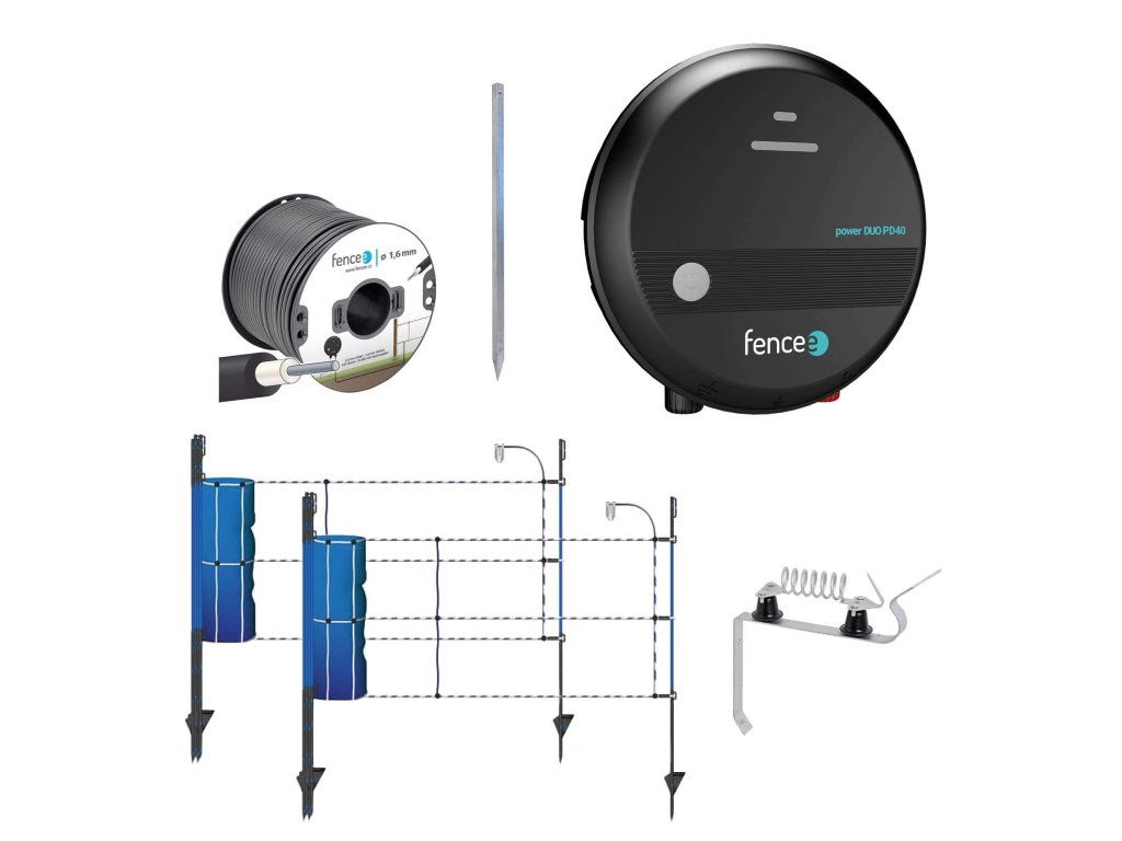 Základem sady je kombinovaný zdroj fencee power DUO PD40 s výkonem 4 J. Lze napájet adaptérem ze sítě 230 V nebo z autobaterie 12 V, kterou využijete také jako záložní zdroj v případě výpadku proudu.