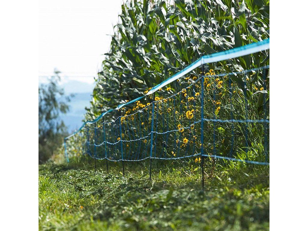 Kompletní sada pro elektrický ohradník s modrou sítí proti divokým prasatům a černé zvěři. Vhodné pro ochranu pole, sadu, úrody a plodin.