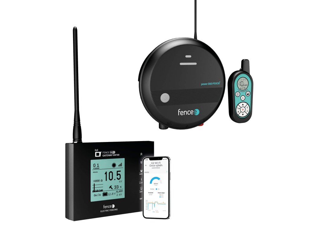 Zvýhodněná sada chytrého elektrického ohradníku s RF generátorem fencee power DUO RF PDX30 (3 J) a centrální WiFi bránou. Ideální řešení pro instalace do 23 km a všechny druhy zvířat.