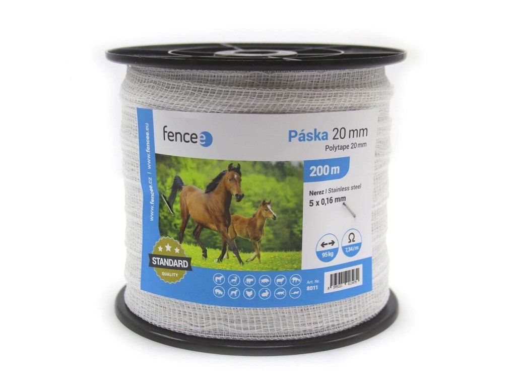Kvalitní bílá páska v návinu 200 m s 5 nerezovými vodiči zajistí dobrou vodivost po celé délce ohrazení. Páska je bezpečnou variantou při stavbě ohradníků pro koně, poníky a oslíky, protože jim nehrozí poranění při střetu s vodičem.