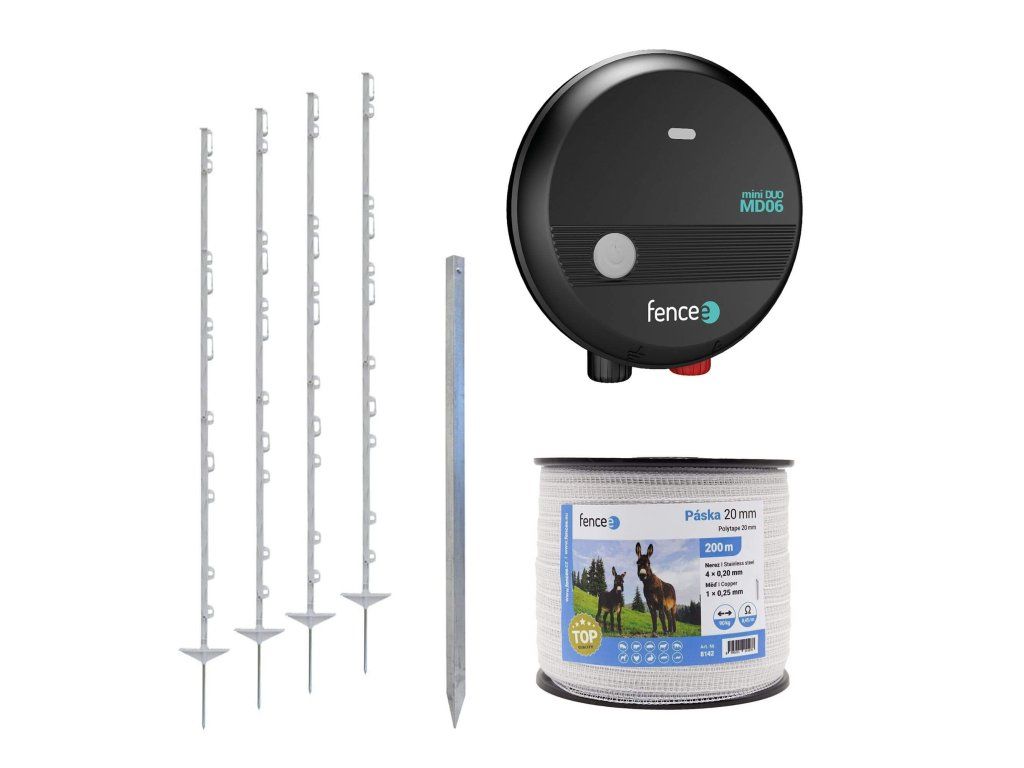 Set elektrického ohradníku s kompletním vybavením pro instalaci malé ohrady pro koně a jejich mláďata. Sada je díky své výšce a citlivosti vhodná také pro vymezení prostoru pro volný pohyb větších psů na zahradách a dvorech.