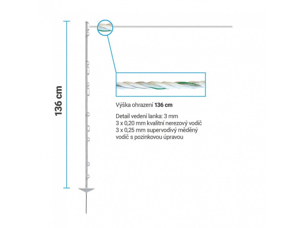 - Obsahem balení je velmi kvalitní lanko ø 3mm s délkou 400 m a plastové sloupky s výškou 136 cm.