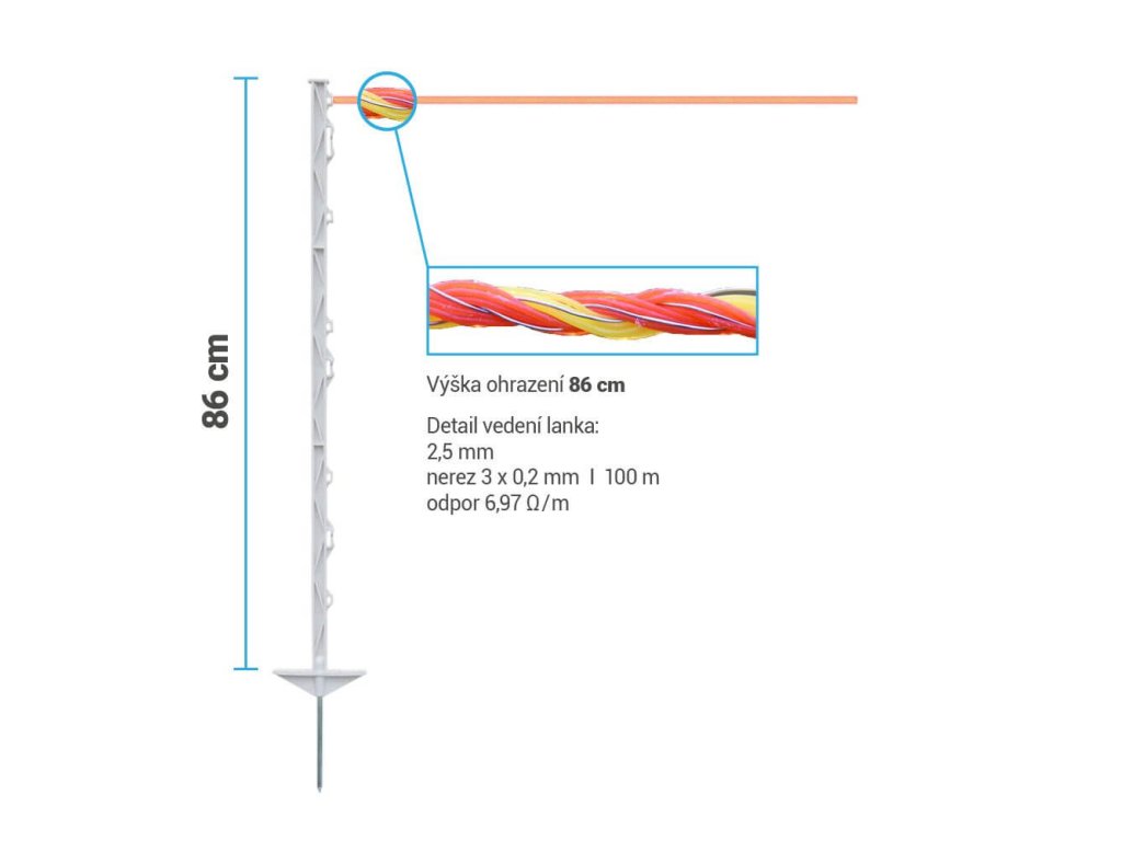 Zesílené plastové sloupky s výškou 105 cm umožňují tažení vodiče v maximální výšce 86 cm nad zemí.