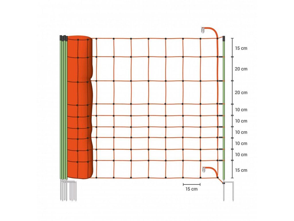 Elektrická síť disponuje 14 tyčemi se dvěma hroty pro maximální stabilitu. Její výška 120 cm spolehlivě zabraňuje přeskočení.