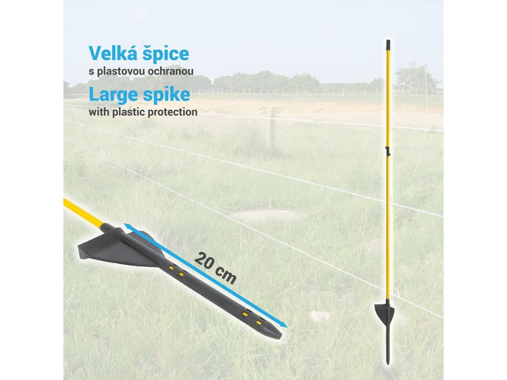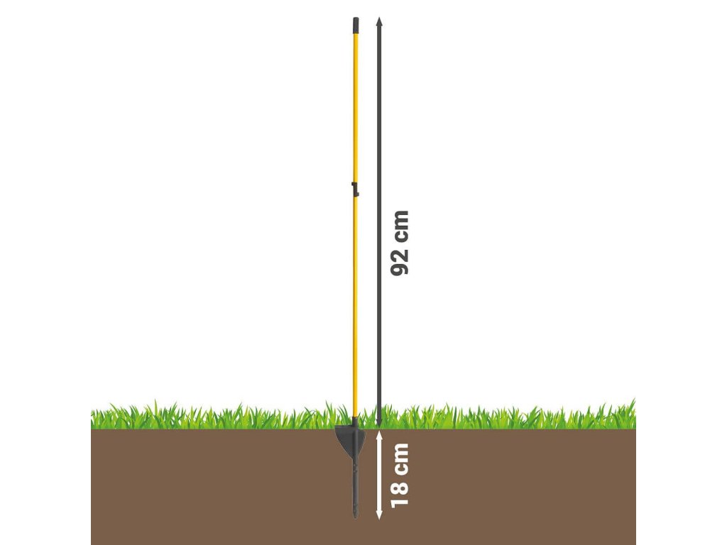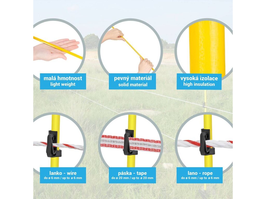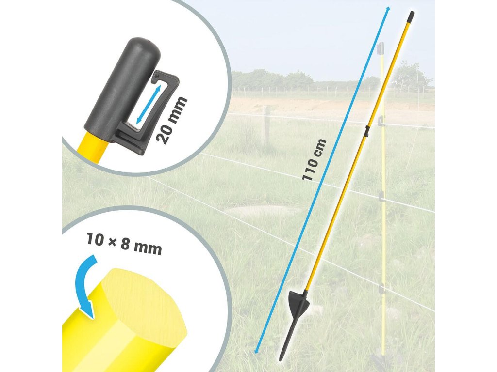 Flexibilní sklolaminátové sloupky s oválným tvarem a výškou 92 cm nad zemí. Nízká hmotnost, vysoká tuhost. Včetně vrchního hlavového izolátoru + 1 přídavný výškově nastavitelný izolátor již na sloupku. Výhodné balení 9 + 1 zdarma.