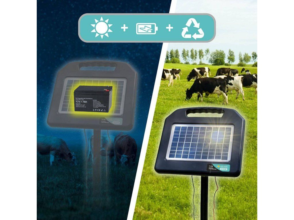 Komplexní solární ohradník 3v1 – zdroj, solární panel a baterie. Vhodný pro elektrické ohrady s maximální délkou instalace 15 km v podmínkách bez husté vegetace. Vhodné pro skot, kozy, koně, poníky, králíky, psy, kočky a jiná drobná zvířata. Dá se použít také proti škůdcům, kuna, vydra, volavka. Lze nabíjet i provozovat s adaptérem do sítě 230 V. Použitelný v hobby a profesionální oblasti. Solární napájení umožňuje použití v místech bez přístupu k elektrické síti.