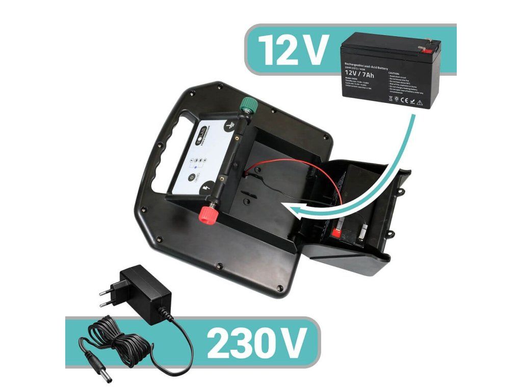 Obsahuje gelovou 12V baterii 7 Ah, kterou lze v případě potřeby snadno vyměnit. Nabízí možnost nabíjení i provozování ze sítě přiloženým adaptérem. Disponuje úsporným režimem Power-Save pro maximálně efektivní využívání baterie.