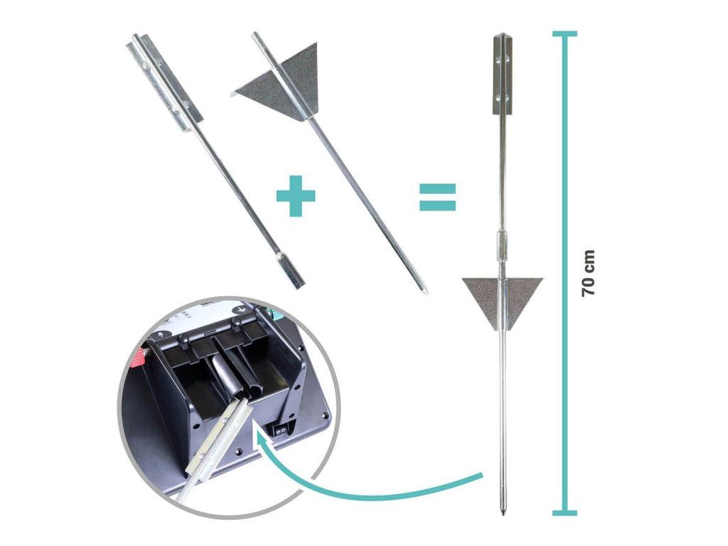 Montážní držák na zadní straně zařízení umožňuje upevnění ohradníku na speciální montážní a zároveň zemnící tyč (obsah balení) na jakémkoliv místě. Pro správnou orientaci solárního panelu ke slunci využijte možnosti otáčení v rozsahu 360º. Zařízení lze nasunout také na ohradníkový T-sloupek nebo univerzální U-slupek.