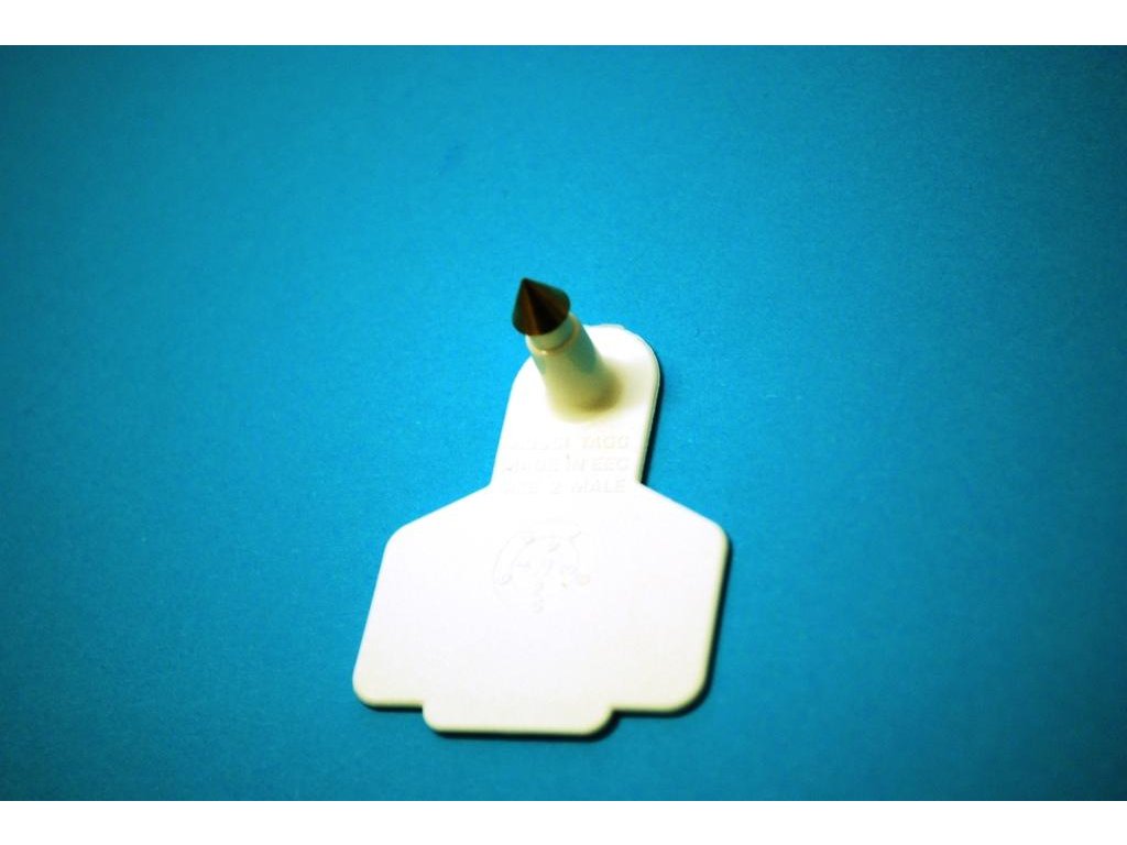 - Velká plastová ušní známka s kovovým hrotem (tvarem podobná skotu, ale menší)