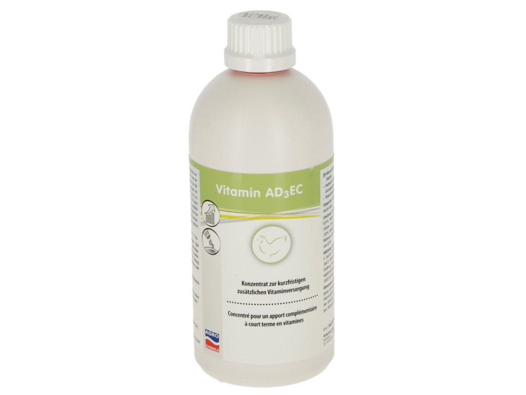 Vitamínový koncentrát AD3EC je vysoce kvalitní tekutý doplněk výživy navržený pro optimalizaci zdraví a vitality drůbeže. Speciální vodě rozpustná formule je ideální zejména pro nosnice a mladé slepice v období zvýšené zátěže nebo stresu.